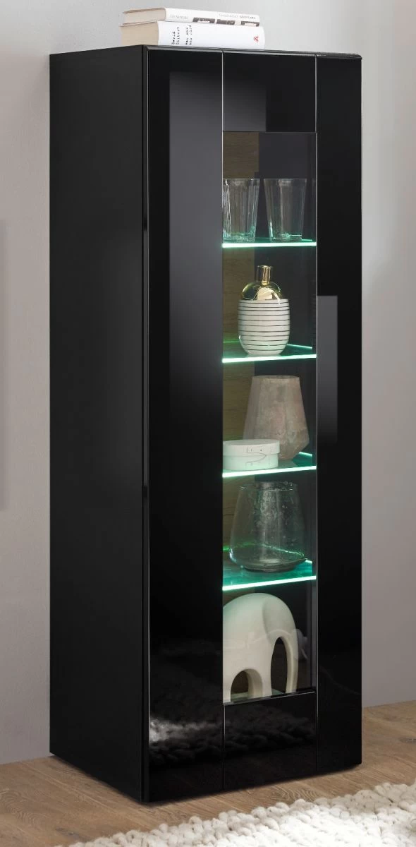 Diese Vitrine sorgt für bewundernde Blicke. Das Modell „Savanna“ in schwarz Hochglanz und Grandson Eiche (45 x 131 cm) ist für Wohn- sowie Speisezimmer ausgezeichnet geeignet und bietet eine Glastür. Als besonderes Extra besitzt es eine nützliche Push-to-Open-Funktion. Durch vier Glasböden ist der Innenraum des Möbelstückes unterteilt. Die hervorragende Qualität des Vitrinenschranks spiegelt sich in ihrer pflegeleichten Beschaffenheit wider. FSC®-zertifiziertes Holz wurde zur Verarbeitung verwendet. Die Vitrine im hochwertigen, modernen Design überzeugt durch ihre Grandson eichefarbene Rückwand, die für zusätzliche Stabilität sorgt. Der Korpus aus attraktivem schwarzem Dekor rundet den Gesamteindruck gekonnt ab. Das Modell „Savanna“ weist eine Gesamthöhe von 131 cm, eine Breite von 45 cm sowie eine Tiefe von 38 cm auf. Die Fronten aus hochglänzend schwarzem MDF vervollständigen darüber hinaus das stimmige Gesamtbild. Berücksichtigen Sie auch die anderen Größenvarianten des Möbelstückes. Sie werden diese Vitrine lieben.